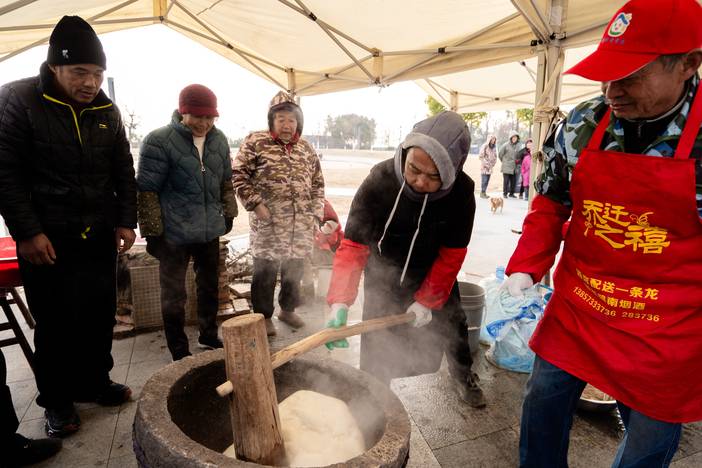 潮汐市集上,糖葫芦、钩针手作、爆米花摊位前市民游客络绎不绝...其中古法年糕摊位排起了长队,“抢糕头,年年糕!”木锤起落间糯米香气四溢,刚出炉的热年糕分享一空。