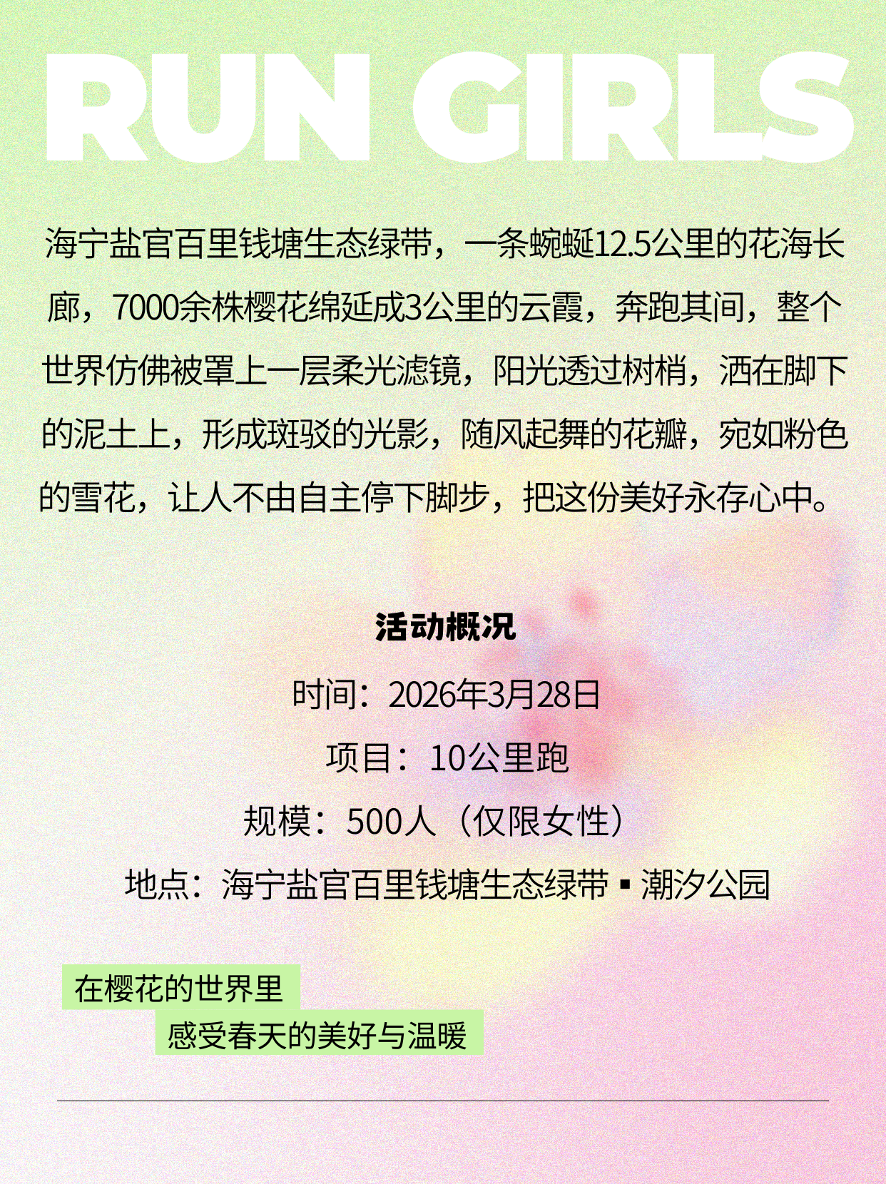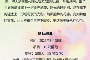 9、比赛线路将从起点(潮汐公园)—九里桥(3公里)—九里桥向前2公里后(折返)—终点(潮汐公园),其中起点至九里桥3公里中部分路段会涉及樱花小路,现场到时会有路口指示牌,路途中九里桥(3公里处)位置设置一个补给站。