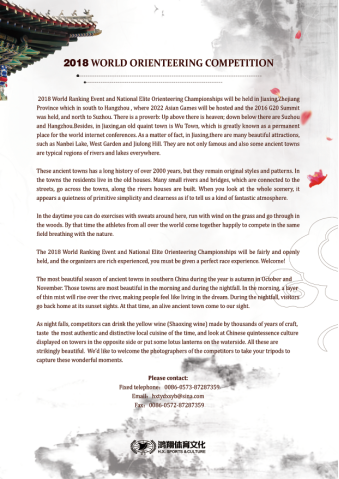 2018年世界定向排位赛和中国定向冠军赛(嘉兴站)由浙江鸿翔体育文化产业有限公司运营。这是浙江省首次引进世界级定向赛事并落户嘉兴。嘉兴作为沪杭、苏杭交通干线中枢,交通便利,东接国际大都市——上海,南连G20峰会与2022年亚运会的主办地——杭州,境内有中国共产党诞生地嘉兴南湖、中国唯一山海湖全景度假地南北湖、典型水乡古镇乌镇、中国历史文化名镇西塘。