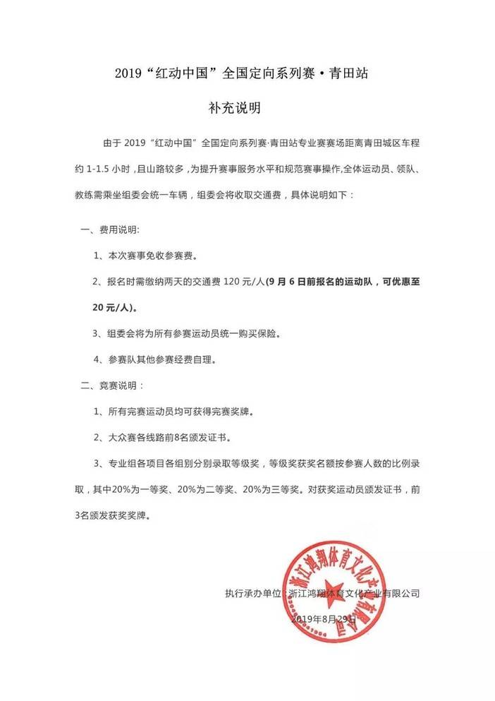 1、专业赛中,赛场距离青田城区车程约1-1.5小时,且山路较多,全体运动员、领队、教练需乘坐组委会统一车辆,报名时需缴纳交通费120元/人。