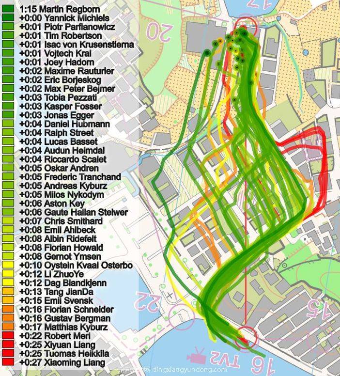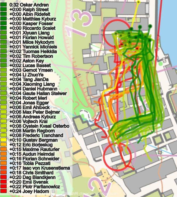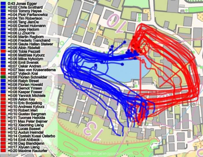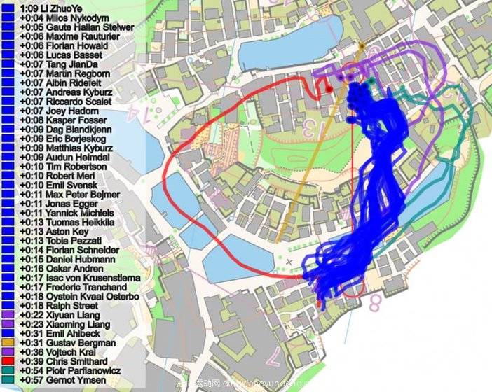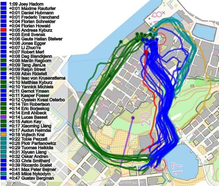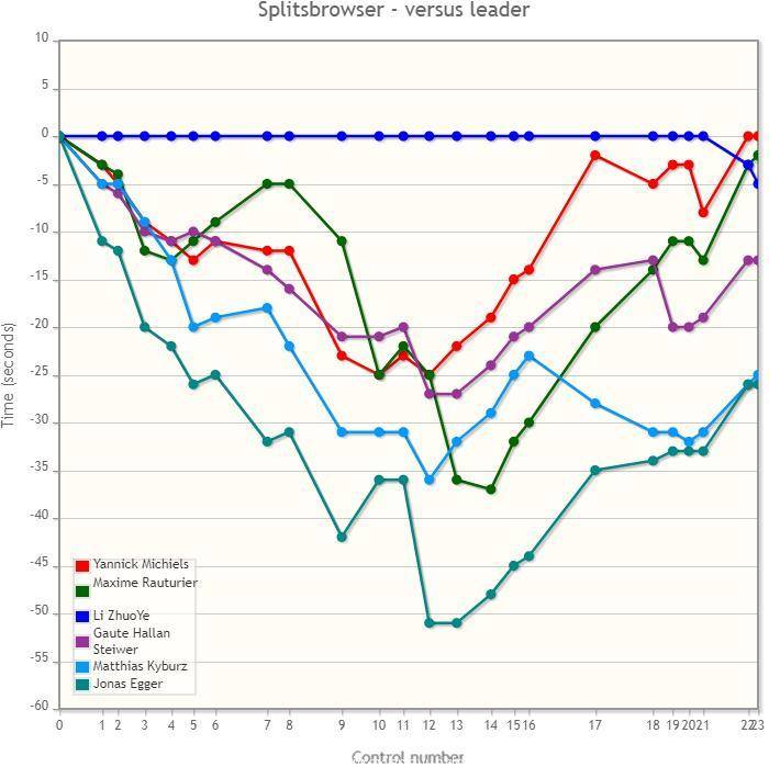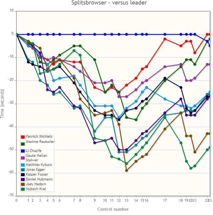 虽然在纸面上看起来没有那么具有挑战性,但在松塘狭窄的小巷里,密集的定向运动要求几乎每条线路都高度集中,这让人很难在比赛中领先,很难在每一个十字路口做出正确的决定。几乎没有人在整个过程中保持零失误——许多最受欢迎的选手在一个或多个地方都输掉了10-15秒。尽管如此,米克尔斯在比赛中始终保持着他强大的注意力,并在比赛快结束的时候将他的速度储备用在了更容易跑的地方。看看部分分裂的时间,米切尔斯落后于李卓业,直到最后第二个控制点,结束时爆发的速度保证了他的胜利。