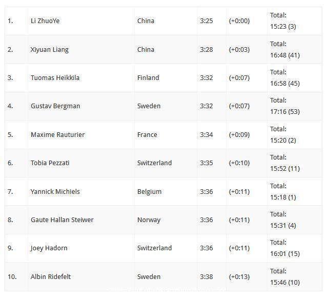 男子组的冠军是亚尼克·米歇尔斯,李卓业仅落后了5秒位居第三。在女子比赛中,瑞士选手西蒙娜·埃博塞尔以10秒的成绩落后于名列第二的郝,萨拉·哈格斯特伦名列第三。女子组最受欢迎的瑞典选手Tove Alexandersson 在比赛开始时犯了一分钟的大错误,以至于在与郝双燕的竞争中输掉了3分。