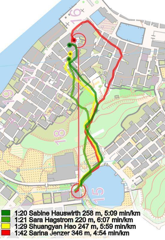 看第15号点,郝双燕在这里实际上也慢了6秒,没有选择最佳路线。亚历山大和伯格曼在“小河”里走的是同一条路——都是湿的,浪费了很多时间。在可跑的部分,Aebersold放松了警惕,犯了一个“初学者错误”。