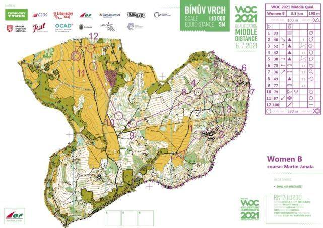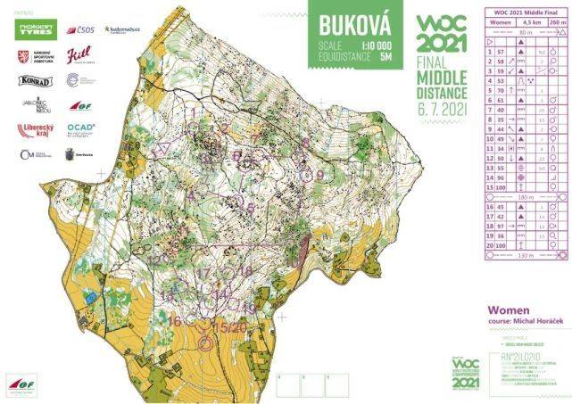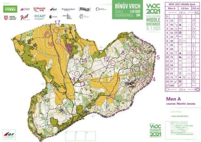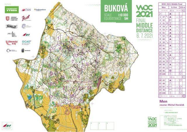 世界定向锦标赛的中距离决赛是在捷克共和国Liberec地区Smrzovka的极具挑战性的地形上进行的。这些线路提供了非常有技术性的定向运动,在那里有必须通过悬崖、巨石场和破碎地面的最佳路线,同时保持方向穿过植被较密而可视性下降的地区。从电视直播图片和轨迹跟踪中可以明显看出,快速地在这种地形奔跑的同时又要集中注意力是一个真正的挑战。