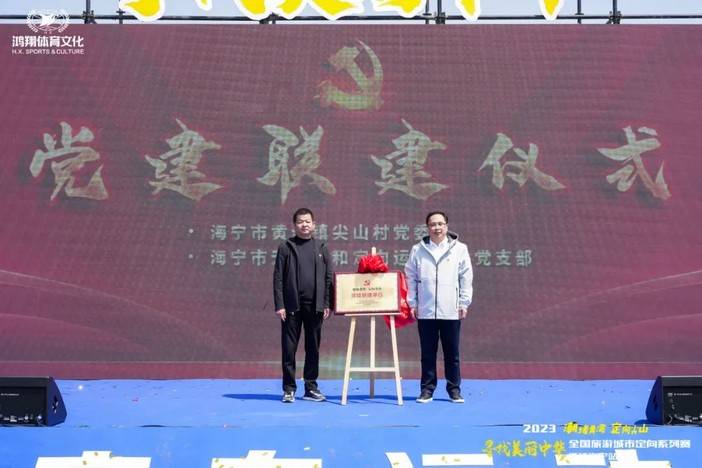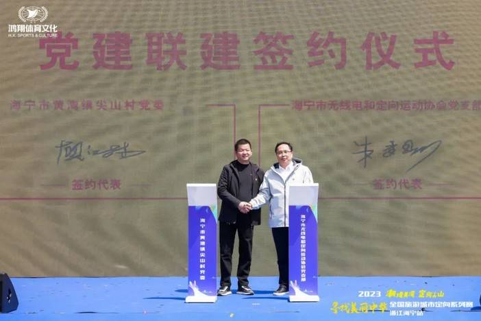 在本次赛事上还举行了海宁市黄湾镇尖山村党委和海宁市无线电和定向运动协会党支部党建联建签约仪式、“潮缘黄湾 定向尖山”党建联建单位揭牌仪式。