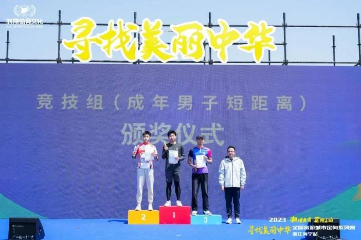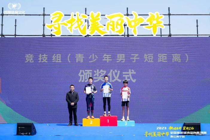 海宁市黄湾镇社会事务办主任 鲍森林为竞技组(青少年男子短距离)颁奖