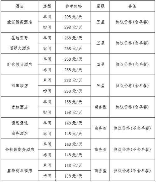 (一)住宿说明:六盘水市为旅游城市,夏季天气凉爽(8月份均温为19.2℃),适合避暑。8月份正值旅游旺季,酒店价格会有较大幅度上涨,且房源较为紧张,望各参赛队确定行程后,尽早预定酒店。