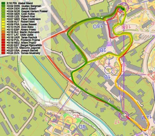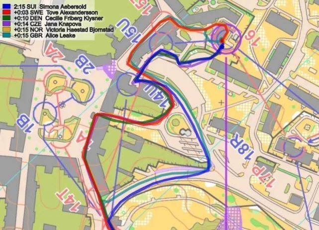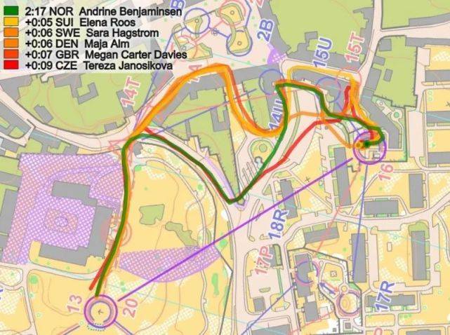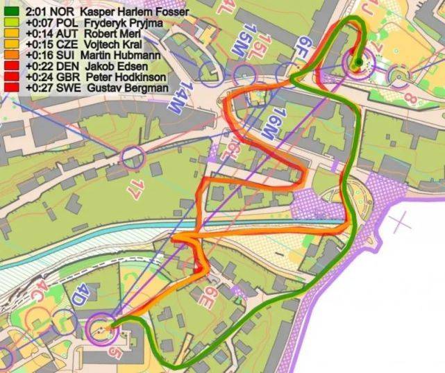 下一个时间差异较大的部分是分支15号点——在分段浏览图上标记浅蓝色(3)。这里的时间损失:挪威和英国(15秒)和捷克共和国(10秒),而Aebersold 追上了Alexandersson几秒钟。轨迹上还不清楚时间损失为何如此之大,例如:挪威与瑞典的路线相同,但仍落后于瑞典12秒。