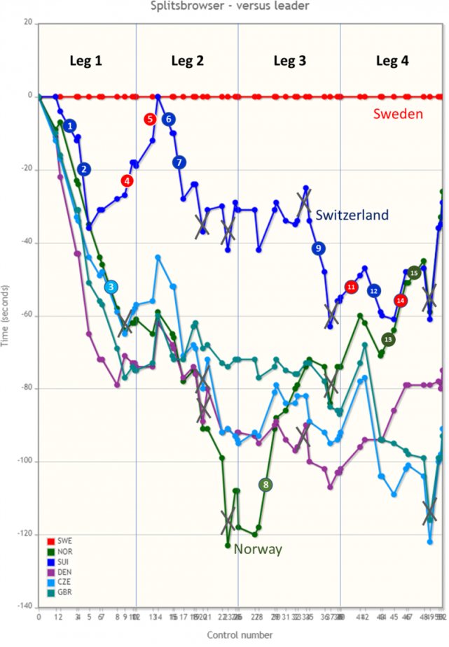 下面的分段浏览图显示了整个过程的总体竞赛进程情况,所有公共检查点都统计了分段时间。在分段浏览图上标记了决定性的点,并将在下面的分析部分中讨论。总的来说,瑞典的Tove Alexandersson在第一回合中段领先35秒,但是瑞士的Simona Aebersold在交接时差距缩短到不到20秒。瑞士的Joey Hadorn刚开始跑得很快,跑了几分钟之后成功赶上了瑞典的Emil Svensk。