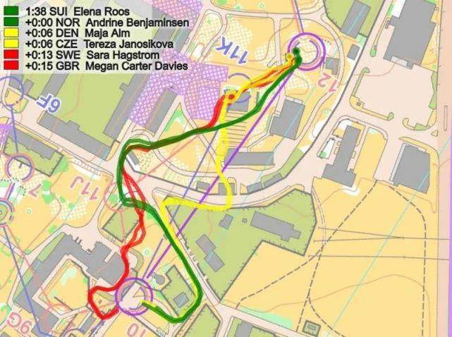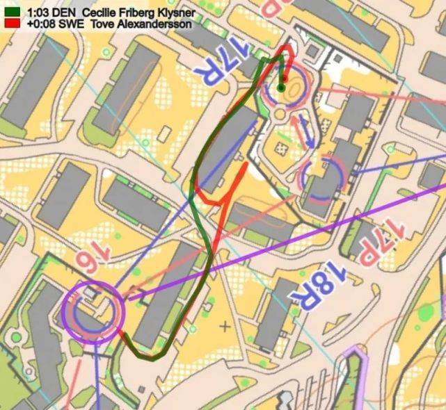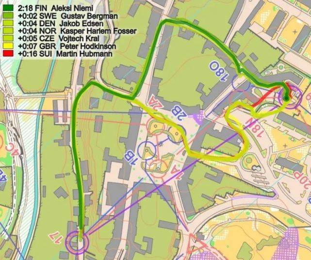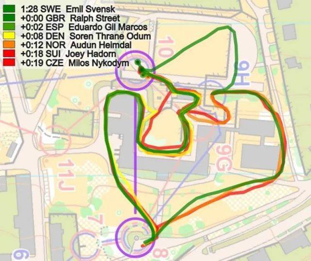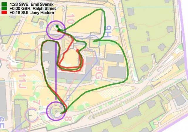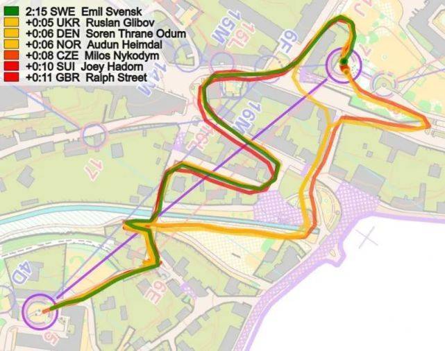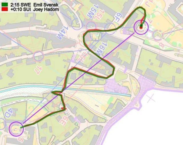 在前几个点,瑞典的Emil Svensk相比快速起跑的Hadorn损失了7秒(未显示在这里),然后在分支4号点损失13秒(如下图所示);在分段浏览图上标记红色(5))。在这里,Svensk(红色路线)在左转第一个房子时犯了一个路线选择的错误。此外,瑞典人还是4D分支(和挪威一样),这似乎比4C分支慢了几秒。Svensk在这里输了13秒,而在第一个点上又损失了7秒,这意味着Svensk被瑞士的Joey Hadorn追上了。
