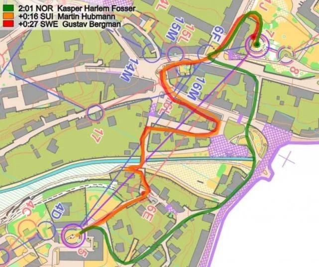 最大的追赶路段是Bergman和Hubmann位于5和7号点之间的部分(在分段浏览图上标记绿色(8))。在这里,Fosser选择了右边最好的路线,而Bergman(+27秒)及Hubmann (+16秒)两者都进入了线路设计者的陷阱,选择了S形路线。部分原因是Fosser较高的奔跑速度,但由于错误的路线肯定有10~20秒的时间损失或更多。
