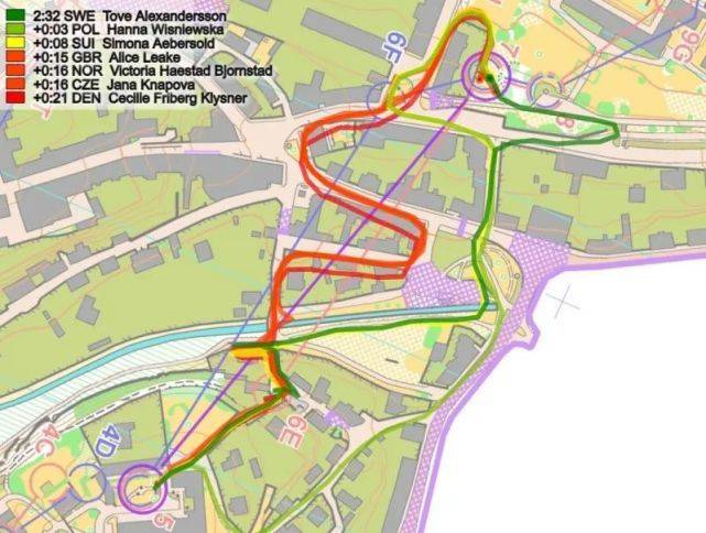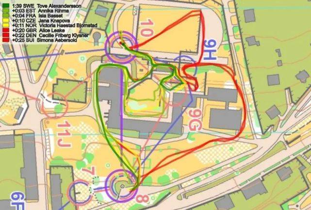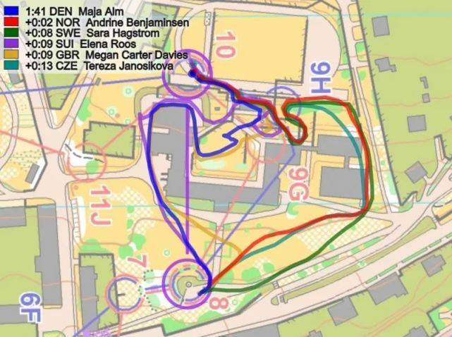 下一个时间差异较大的部分是分支9号点,在分段浏览图上标记为蓝色(2)。这里瑞士在进行9H分支时,从右边绕过足球场(红色路线),相对于Alexandersson损失了25秒。这种巨大的时间损失,根据她的路线选择是很难解释的,因为这个路线选择似乎是最快的。从9H往左转到10号点可能更快(丹麦是这样做,但还是输了22秒;而英国在跟瑞士一样的路线上输掉20秒)。从第一棒次来看,9H分支似乎比9G分支慢了20多秒,但挪威最后一棒的Benjaminsen跑9H分支只比Alexandersson慢了4秒(比Aeberseles快21秒),所以第一棒次的大时间损失并不是因为分支造成的。