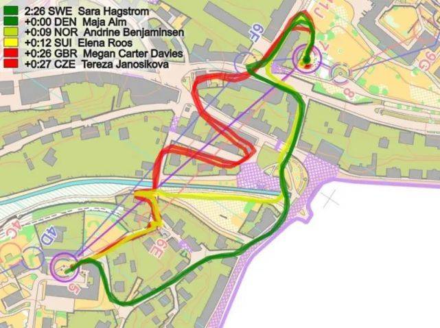 接着轮到Sara Hagström损失时间,这一次损失了13秒。挪威和瑞士 (在分段浏览图上标记红色(14))。这里瑞典和英国都是向左(红色路线)跑到分支11J上,浪费了一些时间。